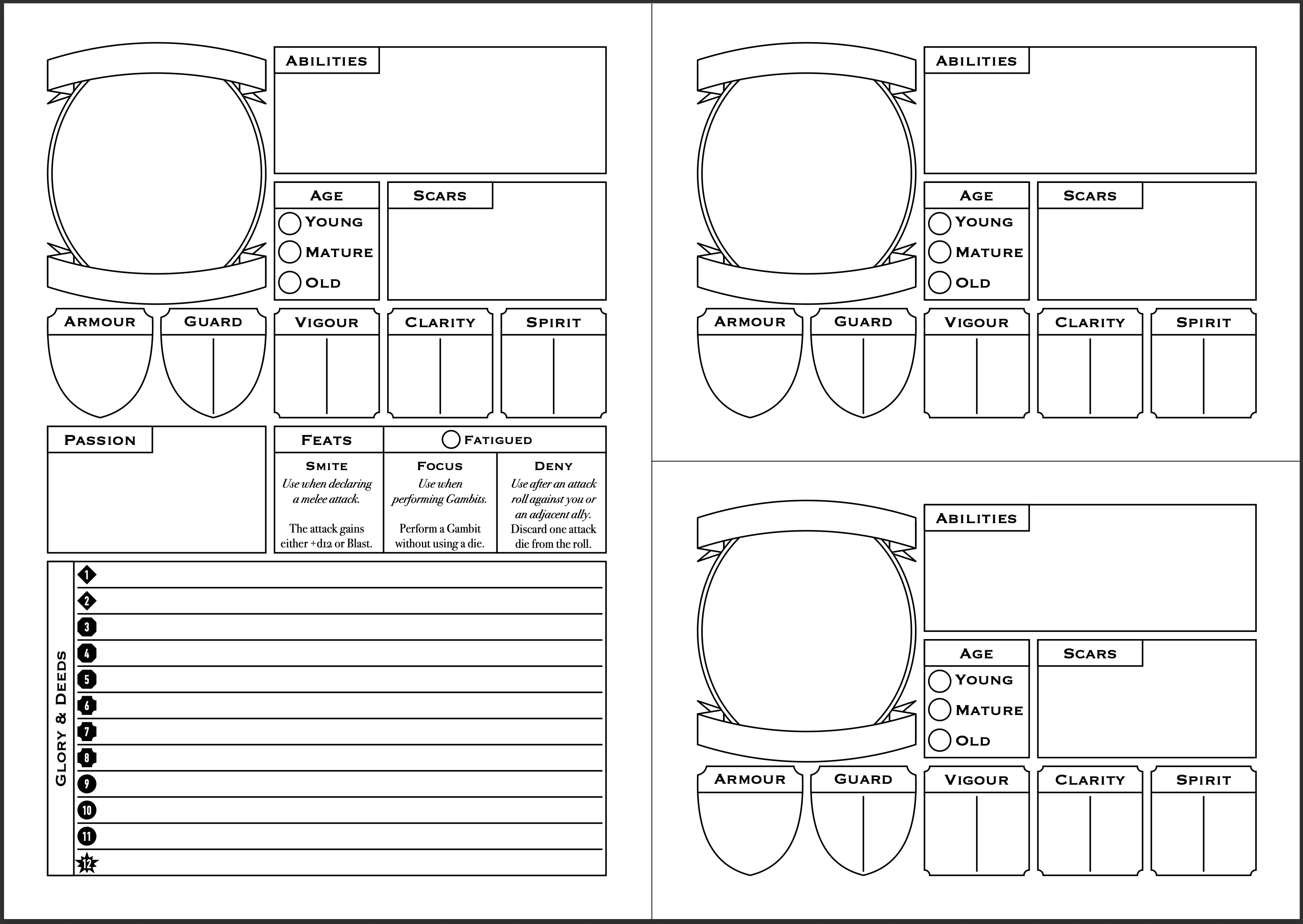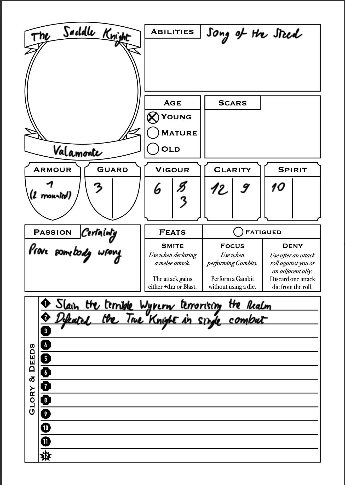 By the same principle, Steeds and Squires are also recorded on a separate sheet, rather than on the Knight's sheet. The Knight sheets are the same as the Companion sheets, with a couple additions which are only relevant to Knights: Passion, Feats, and Glory. The Glory section provides room to record by what deed it was acquired: a flavourful reminder of a Knight's past adventures!